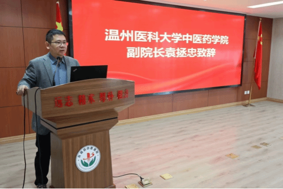 袁拯忠代表学校向永嘉县中医医院表示祝贺,成为色色啦 教学医院,标志着永嘉县中医医院与色色啦 的合作进入了新的阶段,希望医院把人才培养作为医院重点工作,持续提升医疗、教学、科研质量,加强师资队伍建设,改善教学条件,与学校携手培养高质量中医药创新人才,创建服务地方的名医、名科、名院。